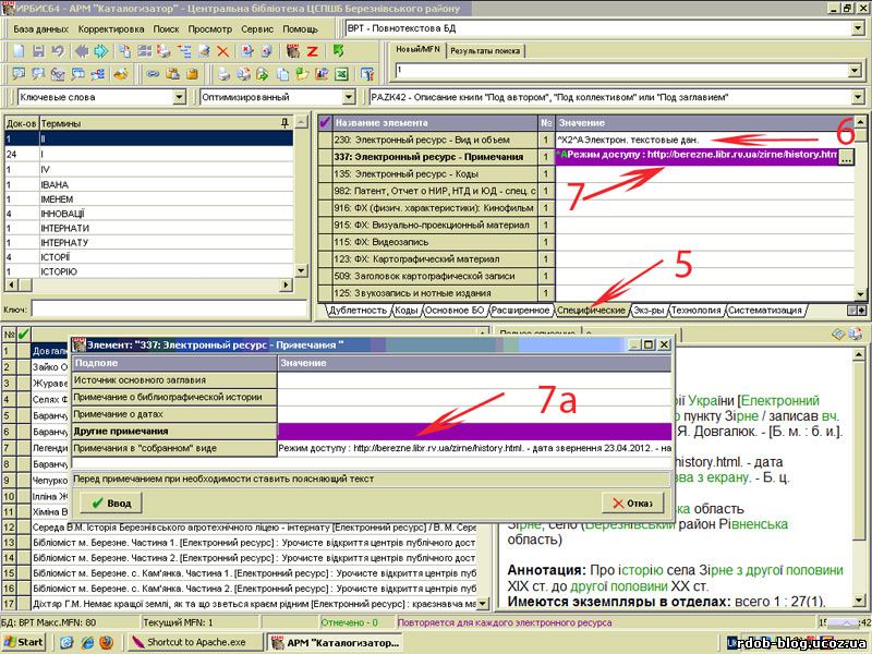 5. Переходимо за заповнення вкладки "Специфические" 6. Заповнюємо поле "230: Электронный ресурс - Вид и объем" 7. Та поле "337: Электронный ресурс - Примечания" 7а. "Примечания в собраном виде", наприклад:Режим доступу : http://berezne.libr.rv.ua/zirne/history.html. - дата звернення 23.04.2012. - назва з екрану